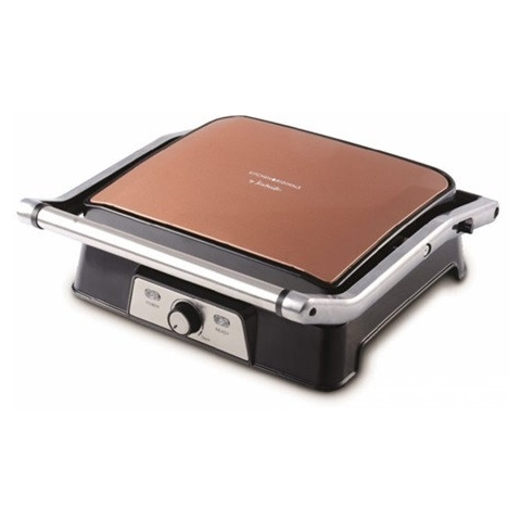 Hús, hal, panini, szendvicsek készítésére Köszönhetően a speciális pántrendszernek a vastag darabokra is tökéletesen illeszkendek a lapok Tapadásmentes bevonattal ellátott fűtőlemezek Lemezfelület: 280 x 230 mm Visszajelző lámpák Olaj/zsírcsepegtető