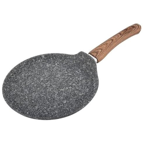 Serpenyő - palacsintasütő, gránit, kerek, az edény teste alumíniumból készült, használható gáz, üvegkerámia és indukciós főzőlapon, mosogatógépben mosható és tapadásmentes felület, alumínium és gránit külső felület, ergonomikus, műanyag fogantyú, magassága 2 cm, serpenyő felső szélének átmérője 24 cm, serpenyő aljának külső átmérője 24 cm, szürke kivitel Az alacsony peremének köszönhetően a kamille serpenyő tökéletesen alkalmas palacsinta k