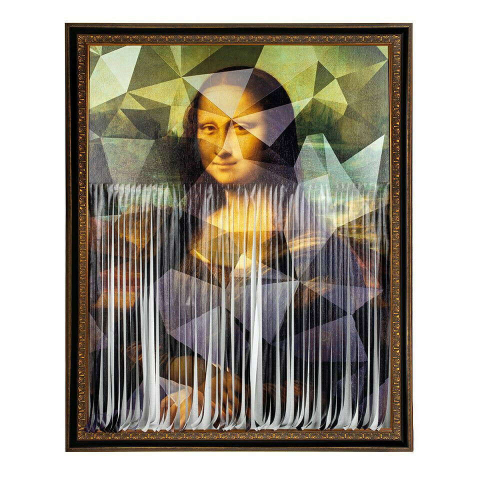 KARE Mademoiselle Lisa modern festmény: Szürrealista Mona Lisa 130x163 cm-es vászonkép Banksy művészetéből ihletet merítő, lenyűgöző modern festmény, mely a Mona Lisa portrét mutatja be egyedi, szürrealista látásmódban. A geometrikus mintákkal átfedő...