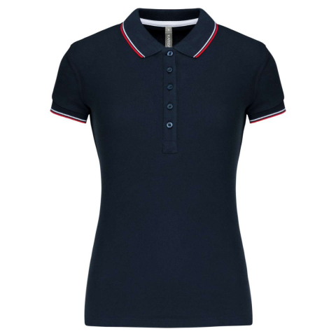LADIES' SHORT-SLEEVED POLO SHIRT 100% pamut piqué5 gombos pántKontrasztos pántos nyak és oldalsó sliccelésA passzén kontrasztos csík a nyaknál és a mandzsettákonDupla tűzésű kivitel a szegélyenSTANDARD 100 by OEKO-TEX® N° CQ 1007/7, IFTH tanúsítvánnyal