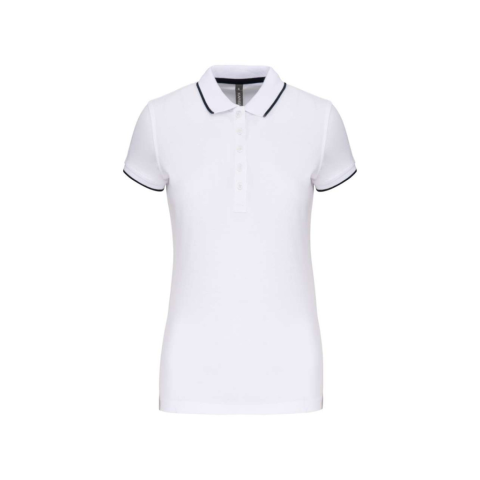 NŐI RÖVID UJJÚ PÓLÓING 100% pamut piquéBordázott gallér kontrasztos csíkkal és kontrasztos alsógallérral (a White színváltozat esetében nincs kontrasztos alsógallér)Kontrasztos pántos nyak és oldalsó sliccelésDekoratív 5 gombos pántBordázott mandzsettá