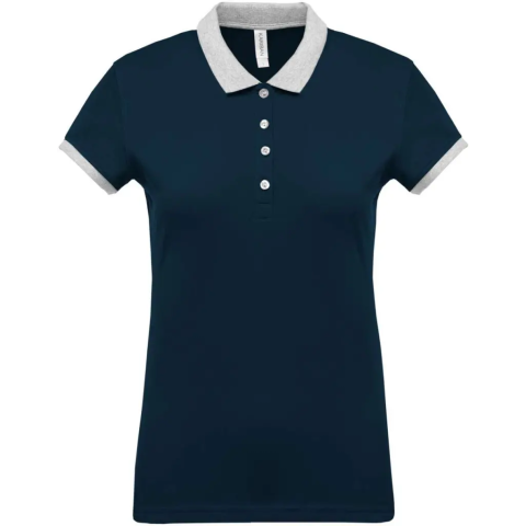NŐI KÉTTÓNUSÚ PIQUÉ PÓLÓING 100% előzsugorított pamut piqué (Oxford Grey: 90% pamut/10% viszkóz)Kontrasztos passzé a nyakon és a mandzsettákonKontrasztos pántos nyak és oldalsó sliccelésKontrasztos belső gombolópánt 4 gombbalDupla tűzésű kivitel a szeg