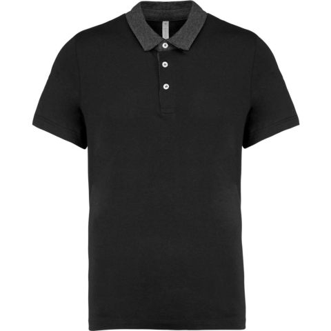MEN'S TWO-TONE JERSEY POLO SHIRT 100% enzimmosott fésült pamut (Dark Grey Heather: 65% poliészter/35% pamut) Kontrasztos nyak és belső pánt 3 fehér gyöngyház gombbal Dupla tűzésű kivitel a mandzsettákon és a szegélyen STANDARD 100 by OEKO-TEX®N° C