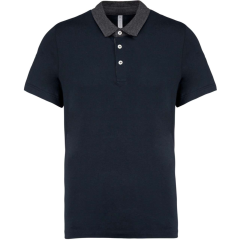 FÉRFI KÉTTÓNUSÚ JERSEY PÓLÓING 100% enzimmosott fésült pamut (Dark Grey Heather: 65% poliészter/35% pamut) Kontrasztos nyak és belső pánt 3 fehér gyöngyház gombbal Dupla tűzésű kivitel a mandzsettákon és a szegélyen STANDARD 100 by OEKO-TEX®N° CQ1