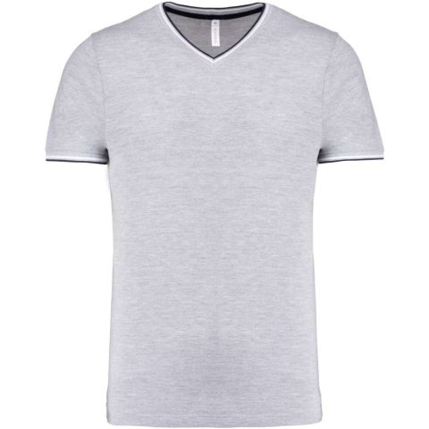 FÉRFI V-NYAKÚ PIQUÉ PÓLÓ 100% fésült pamut piqué (Oxford Grey: 90% pamut/10% viszkóz)Bordás kivitel kontrasztos csíkokkal a nyaknál és a mandzsettákonKontrasztos pántos nyak és oldalsó sliccelésDupla tűzésű kivitel a szegélyenSTANDARD 100 by OEKO-TEX®
