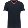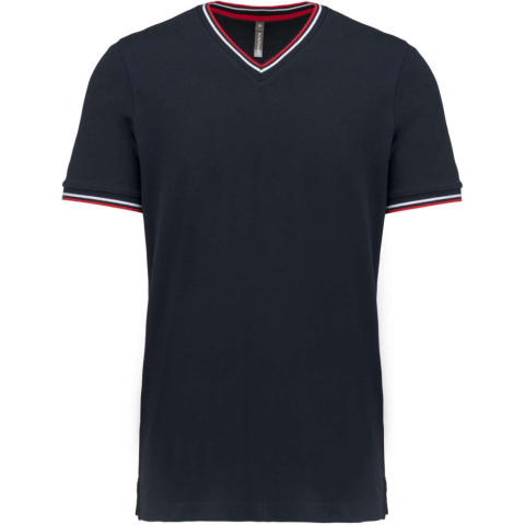 FÉRFI V-NYAKÚ PIQUÉ PÓLÓ 100% fésült pamut piqué (Oxford Grey: 90% pamut/10% viszkóz)Bordás kivitel kontrasztos csíkokkal a nyaknál és a mandzsettákonKontrasztos pántos nyak és oldalsó sliccelésDupla tűzésű kivitel a szegélyenSTANDARD 100 by OEKO-TEX®