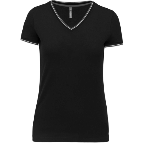 NŐI V-NYAKÚ PIQUÉ PÓLÓ 100% fésült pamut piqué (Oxford Grey: 90% pamut/10% viszkóz)Bordás kivitel kontrasztos csíkokkal a nyaknál és a mandzsettákonKontrasztos pántos nyak és oldalsó sliccelésDupla tűzésű kivitel a szegélyenSTANDARD 100 by OEKO-TEX® N°