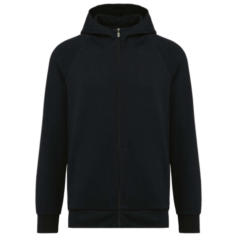 MEN'S ZIPPED HOODIE 70% pamut / 26% poliészter / 4% elasztánFésült pamutInterlock anyagLSI kezelés (alacsony zsugorodású interlock)Két részből szabott kapucni, a dzseki többi részével azonos anyaggal bélelve, húzózsinór nélkülA nyaknál letűzvePántos ny