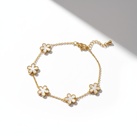 Amikor egy nő ékszert visel, az nem csupán egy kiegészítő — hanem egy érzés. Egy finom, kimondatlan üzenet a világnak. Az Abstract Flowers aranyozott karkötő a természet vidám könnyedségét zárja ékszerbe. A gyöngyházfényű margaréta m