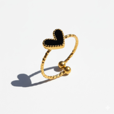 Amikor egy nő ékszert visel, az nem csupán egy kiegészítő — hanem egy érzés. Egy finom, kimondatlan üzenet a világnak. Ez a gyűrű egyszerre finom és visszafogott– az aranyszínű pántot egy fekete szív díszíti, ami rögtön magára vonja