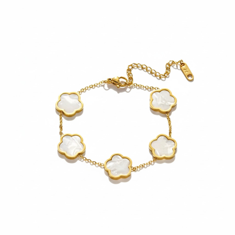 Amikor egy nő ékszert visel, az nem csupán egy kiegészítő — hanem egy érzés. Egy finom, kimondatlan üzenet a világnak. A karkötőt több clover motívum díszíti, amelyek egységes ritmusban követik egymást a finom láncon. A medálok és a lán