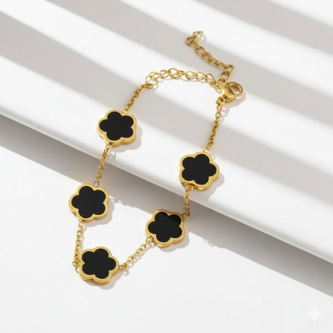 Amikor egy nő ékszert visel, az nem csupán egy kiegészítő — hanem egy érzés. Egy finom, kimondatlan üzenet a világnak. A karkötőt több clover motívum díszíti, amelyek egységes ritmusban követik egymást a finom láncon. A medálok és a lán