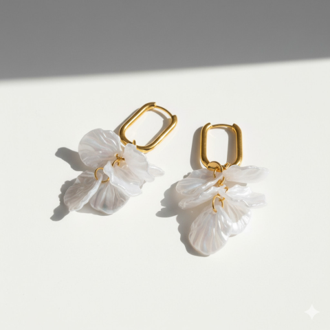 Amikor egy nő ékszert visel, az nem csupán egy kiegészítő — hanem egy érzés. Egy finom, kimondatlan üzenet a világnak. A fénylő aranyozott fülbevaló és a gyöngyházfényű szirmok különleges textúrája együtt ad egy friss, modern hatást.