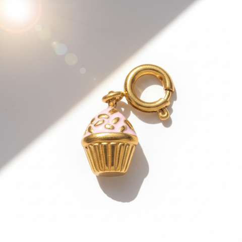 Amikor egy nő ékszert visel, az nem csupán egy kiegészítő — hanem egy érzés. Egy finom, kimondatlan üzenet a világnak. A Muffin charm a játékosság és az apró örömök megtestesítője. Az aranyozott talp és a lágy rózsaszín máz arany szórás