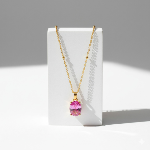 Amikor egy nő ékszert visel, az nem csupán egy kiegészítő — hanem egy érzés. Egy finom, kimondatlan üzenet a világnak. Az Ovális kristály nyaklánc középpontjában egy finoman csiszolt, rózsaszín cirkónia kő ragyog, amely ovális alakú for