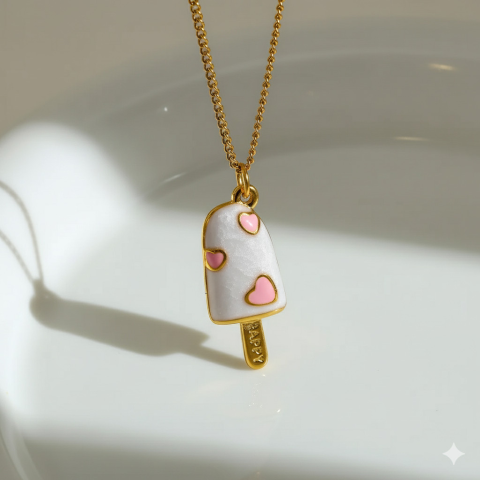 Amikor egy nő ékszert visel, az nem csupán egy kiegészítő — hanem egy érzés. Egy finom, kimondatlan üzenet a világnak. A játékos hangulatú nyaklánc egy jégkrém medált hoz el, amelyet finom, rózsaszín szívek díszítenek. A prémium rozsdam