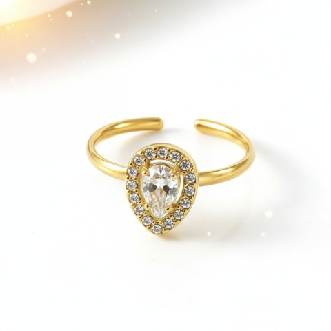 Amikor egy nő ékszert visel, az nem csupán egy kiegészítő — hanem egy érzés. Egy finom, kimondatlan üzenet a világnak. A gyűrű központjában egy csepp formájú, áttetsző cirkónia kő csillan meg, amelyet körben apró, ragyogó kövek koszorúj
