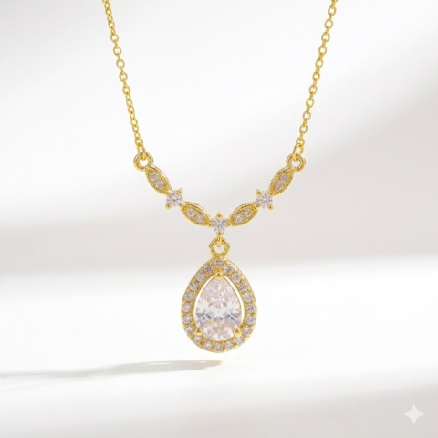 Amikor egy nő ékszert visel, az nem csupán egy kiegészítő — hanem egy érzés. Egy finom, kimondatlan üzenet a világnak. Különleges lágy érzelmeket sugárzó nyaklánc csepp alakú, cirkónia kővel díszített medállal. A 18 karátos arannyal