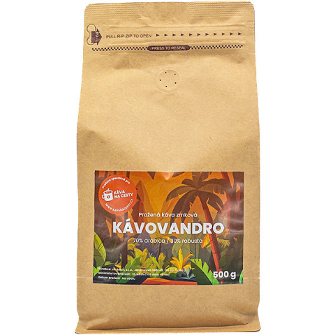 Kávé - szemes, kávéfajták keveréke, hozzáadott aromaanyagok nélkül, közepes pörkölésű, származási hely Brazília és India, pörkölés helye Cseh Köztársaság, csomag tömege 500 g, 70 adag, allergének nélkül Kávovandro utazókávé500 gSzemes kávé praktikus, zárható csomagolásban. A Kávovandro Arabica és Robusta keveréket tartalmaz. Közepes pörkölésű és kiegyensúlyozott ízű. Kávé utazóknakA Kávovandro s