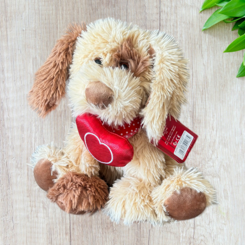 Pihe puha plüss kutya, szívvel a szájában. Méret:28cm Új, címkés termék.
