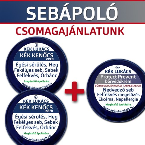 KÉK Lukács Sebápoló csomag az érzékeny, gyulladt vagy sérült bőr természetes támogatására. 2db KÉK Kenőcs Zéró 2x30ml + 1db Protect&Prevent bőrvédőkrém 55ml Ez a két kiváló krém együttesen hatékony segítséget nyújt a fekélyes sebek, lábszárfekély, felfek