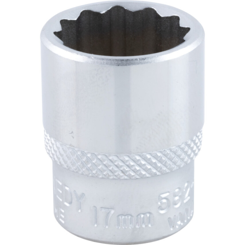 12 szögű kivitel amely nagyobb nyomatékot eredményez. Krómozott, polírozott, króm-vanádium acél. Belül letört élekkel a csavarfejekre való gyors ráfogás érdekében. Belső négyszög minden oldala horonnyal.