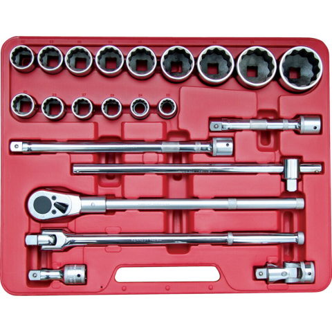 L22M - 12 szögű dugókulcsok: 22, 24, 26, 27, 29, 30, 32, 33, 36, 38, 41, 46, 50, 55 és 60mm. Kiegészítők: ipari, irányváltós, fémnyelű racsnis hajtószár, T-hajtószár, csuklós hajtószár, univerzális csukló, 100, 200 és 410 mm-es standard hosszabbító. Paten