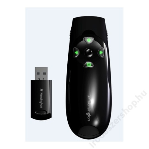 Prezentációs távirányító, zöld lézer, vezeték nélküli, KENSINGTON (BME72426) -zöld mutatólézerrel, amely erősebb a vörös lézernél -vezeték nélküli 2,4 GHz-es technológia -csatlakoztatás után azonnal használható, nincs szükség driver telepítésére -vezér