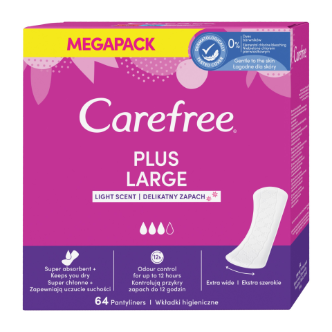 Carefree Plus Large intimbetét könnyed illattal 64 dbA Carefree Plus Large intimbetétek könnyed illattal biztosítják a kellemetlen szagok elnyomását és a hosszan tartó frissesség érzését akár 12 órán keresztül. Rendkívül légáteresztőek és 64-es kiszerelésben kaphatók. A betétek a frissesség érzetét biztosítják, kellemes és friss illatúak. A Carefree Plus Large intimbetétekkel mindenhol remekül érezheti magát. Akár sportolni, akár dolgozni megy, vagy csak o