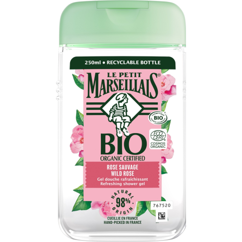 Krémes tusfürdő Bio vadrózsa Le Petit Marseillais 250mlKrémes tusfürdő Bio vadrózsa Le Petit Marseillais 250 ml-es tartalommal puha és megfelelően krémes, a gél táplálja, hidratálja bőrét és minden érzékszervnek tetszetős. A Le Petit Marseillais BIO minősítésű bio tusfürdő, a wild Rose kézzel szedett, dél-franciaországi vadrózsák kivonatait tartalmazza. Összetételének köszönhetően nem csak a bőrét, hanem bolygónkat is ápolja. Rendelkezik az Ecocert Cosmo