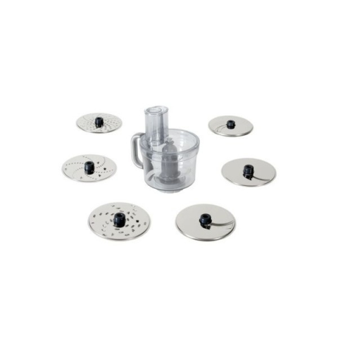 Ez a Food Processor Tritan ™ nevezetű, mosogatógépben is mosható törhetetlen anyagból készült. A 6 lemez biztosítja a finom és durva reszelést (például a parmezánt sajt reszelését), szeletelést vagy julienne csíkok készítését. Csakúgy, mint a késpengét, vágó tárcsát is is lehet bele tenni amivel a vékony és vastag szeletelés, könnyed, továbá finom és durva reszelő is hozzáadható.