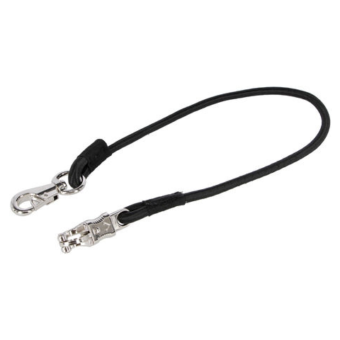 Stabil, rugalmas kikötőzsinór forgó bullsnappal és pánikhoroggal. Különböző kikötési lehetőségekhez az istállóban, a mosóhelyen, az akasztón stb. Törőterhelés kb. 350 kg. Több méretben kapható. Színe fekete.