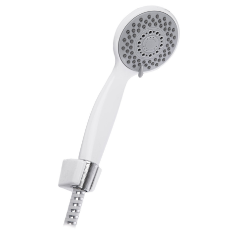BIANCO 3-funkciós zuhanykészlet – fehér + krómTermék jellemzőkZuhanyfej: 3 permetmód (eső, masszázs, kombinált) • Ø 8 cm • AntiCalc fúvókákTömlő: 150 cm fehér PVC, krómozott spirálszalaggal megerősítvePonttartó: állítható dőlésszög • bármilyen magassá
