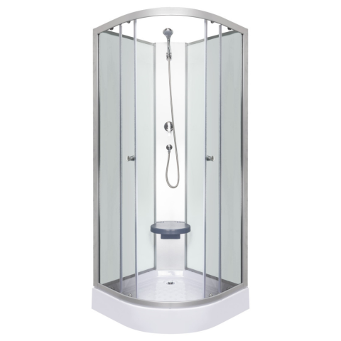 Evora hátfalas zuhanykabin 90 × 90 cm-es méretekkelTechnikai adatok:Méretek 90 × 90 × 205 cmBeépítés – sarokÜveg – 4 mm, edzett, grafit első üvegek, fehér hátfal üvegekProfilok - alumínium, szaténAjtók – kétszárnyú, tolóajtóZuhanytálca - akril, fehérA