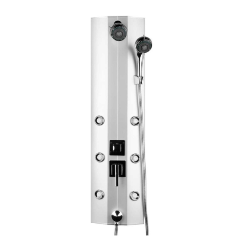 Moonlight hidromasszázs zuhanypanel PVC-bőlMűszaki adatok:Szatén színűMéretek:magassága 101 cm,szélesség 26,5 cm,mélysége 19 cm5 féle fúvóka a kézi- és esőzuhanyban: fókuszált, szórt, öko, vegyes6 db forgatható hidromasszázs fúvókaFalra vagy sarokba s