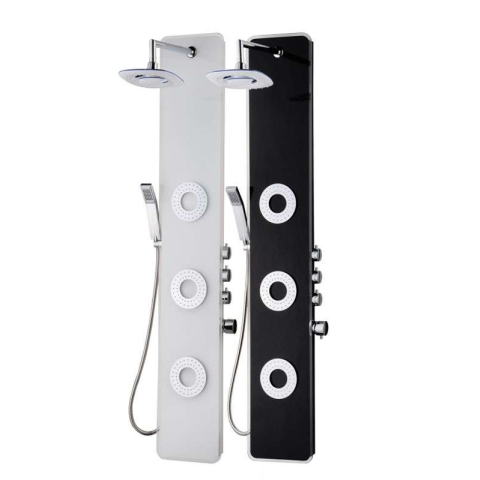 Tore BLACK zuhanypanel alumíniumból és üvegbőlMűszaki adatok:Fekete színMéretek:magassága 150 cm,szélessége 29,5 cm,mélysége 9 cmmélysége esőzuhannyal 53 cm1 fúvóka típus kézi zuhanyon2 féle esőzuhanyfejA fúvókák, esőzuhany és fejhallgató külön áramlá
