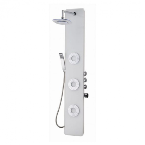 Tore hidromasszázs zuhanypanel, alumíniumból és üvegbőlMűszaki adatok:fehér színMéretek:magassága 150 cm,szélessége 29,5 cm,mélysége 9 cmmélysége esőzuhannyal 53 cm1 fúvóka típus kézi zuhanyon2 féle esőzuhanyA fúvókák, esőzuhany és fejhallgató külön á