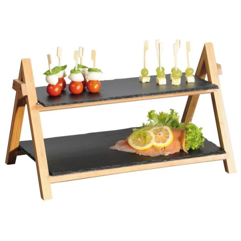 A Kesper kétszintes tálalóállvány bambuszfából készült, és 2 természetes pala lappal rendelkezik, amelyek méretei 36,5x13,5 cm és 36,5x24,5 cm. A szintek közötti távolság 13 cm. Alkalmas különféle ételek tálalására.