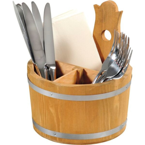Ez a hordó alakú evőeszköztartó faállvány elsősorban éttermeknek ajánlott, de akár a háztartásokban is használható. A belseje 3, elkülönített részre van elosztva. Anyaga festett fa.