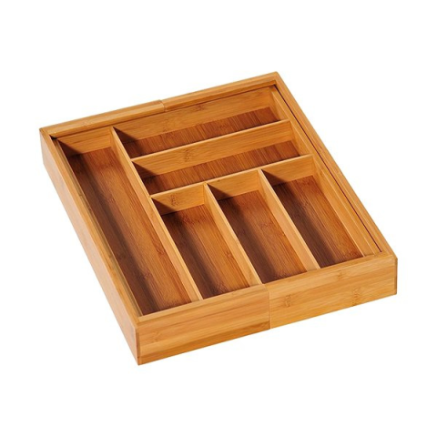Evőeszköztartó fiókba - bambusz, állítható szélesség 35 - 58 cm, magassága 6 cm, mélysége 43 cm, 8 rekesz, barna kivitel Kesper kihúzható evőeszköztálca 35-58cm termék legfontosabb jellemzői Eme KESPER evőeszköztartó fiókba minden háztartás számára tökéletes kiegészítő Segít a konyhai eszközök hatékony rendszerezésében