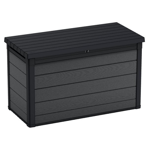 Kerti tárolódoboz - műanyag, lezárási lehetőség, űrtartalma 757 l, ellenálló UV sugárzás és időjárási hatások ellen, 2 ülőhely, a doboz belső terének teherbírása 75 kg, fedél teherbírása 50 kg, mérete 90 × 152 × 72,5 cm (Ma×Sz×Mé), fa imitáció, szürke és fekete kivitel, tömege 26000 g A nagyszerű, 757 l űrtartalommal rendelkező Keter kerti tároló láda elegendő helyet kínál a szezonális kerti kellékek tárolására. A műanyag szerkezet könnyű és