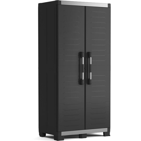 Kerti tároló szekrény - műanyag, zárható, lábakkal, 3 polcos, polc terhelhetősége 45 kg, mérete 188 × 89 × 54 cm (Ma×Sz×Mé), tömege 28,7 kg, fekete kivitel A megbízható Keter műanyag kerti tároló szekrény ideális szerszámok, kerti felszerelések vagy tisztítószerek tárolására. A zárszerkezet garantálja, hogy a szekrényt biztonságosan elzárja az illetéktel