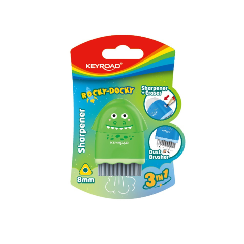 HEGYEZŐ 1 LYUKÚ RADÍRRAL ÉS PORKEFÉVEL KEYROAD ROCKYDOCKY VEGYES SZÍNEK Elfér a tolltartókban egy pingvin, bagoly vagy egy krokodil? 3 az 1-ben funkció: hegyező, radír és szemét seprű PVC mentes radírral 8 mm átmérőjű ceruzákhoz és zsírkrétákhoz mókás