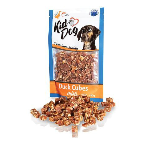 Ez a prémium minőségű jutifalat tökéletes választás, ha kutyádnak ízletes és tápláló jutalmat szeretnél biztosítani, amely hosszabb ideig lefoglalja és elégedettséggel tölti el. KidDog Mini Duck Cubes - jutalomfalat (kacsa, tőkehal) kutyák részére (80g