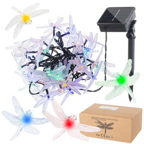 Szitakötő alakú napelemes kerti lámpák - feltűnő dekoráció, amely bármelyik erkélyt vagy teraszt csodálatos pihenőhellyé varázsolja. Vízálló: IP65. LED színe: többszínű. Teljes hossza: 6,5 m. NAPELEMES SZITAKÖTŐ KERTI LÁMPÁK 6.5M 30LED TÖBB SZÍNŰSz