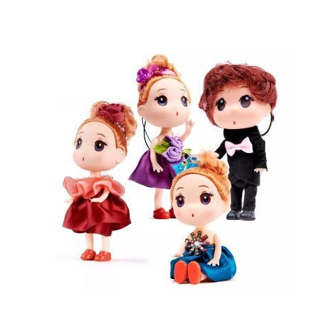 - Kiváló minőségű és részletgazdag kidolgozás - Elegáns ruhákba öltöztetett babák - A fiú baba fekete frakkot, rózsaszín csokornyakkendőt és fekete cipőt visel - A lány babák lila, bordó és sötétkék ruhákban vannak, mindegyikük fején hozzáillő virágdísz található - A ruhák a babákra vannak ragasztva - Mozgatható végtagok: a babák ültethetők és állíthatók - A babák hátulján fém akasztó található, így könnyen rögzíthetők kulcscsomóra, hát