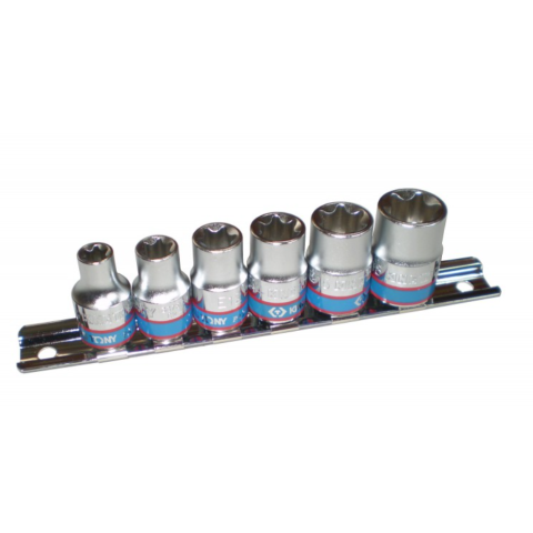 Minőségi King Tony márkájú 6 részes torx-dugókulcs készlet 3/8˝ 3106PR King Tony torx dugófej készlet tartalma 3375M torx dugófejek: E8; E10; E12; E14;E16; E18 Tartósín és klipszek King Tony torx dugókulcsfej jellemzői Metrikus méret DIN 3120
