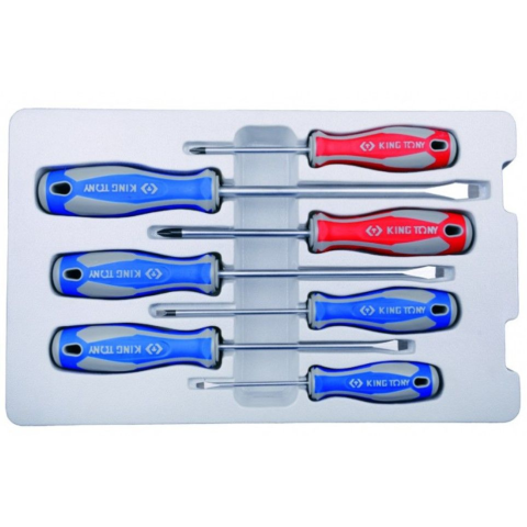 Minőségi King Tony márkájú 7 részes csavarhúzó készlet 30117MR King Tony csavarhúzó készlet tartalma 2db PH csavarhúzó: PH1x80, PH2x100 5db lapos csavarhúzó: 3x75, 4x100, 5,5x125, 6,5x150mm, 8x175mm King Tony csavarhúzó készlet jellemzői S2-es