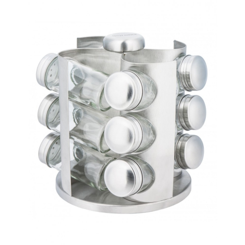 Kinghoff 12 darabos fűszertartó minőségi rozsdamentes acél állvánnyal, ami forgatható. Üveg tárolók menetes rozsdamentes acél fedővel. Dekoratív, modern megjelenés bármely konyhába.