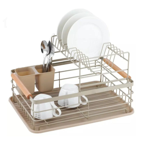 Kinghoff prémium edényszárító kosár fémből, bézs porfestéssel, tömörfa markolattal. Tartós fém konstrukció lágy porfestéssel az edények védelméért, valamint egy alsó PVC csepegtető tálcával. A kosár része egy két részes leválasztható evőeszköz szárító, va
